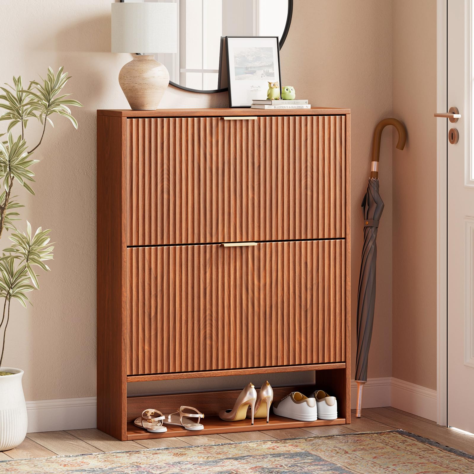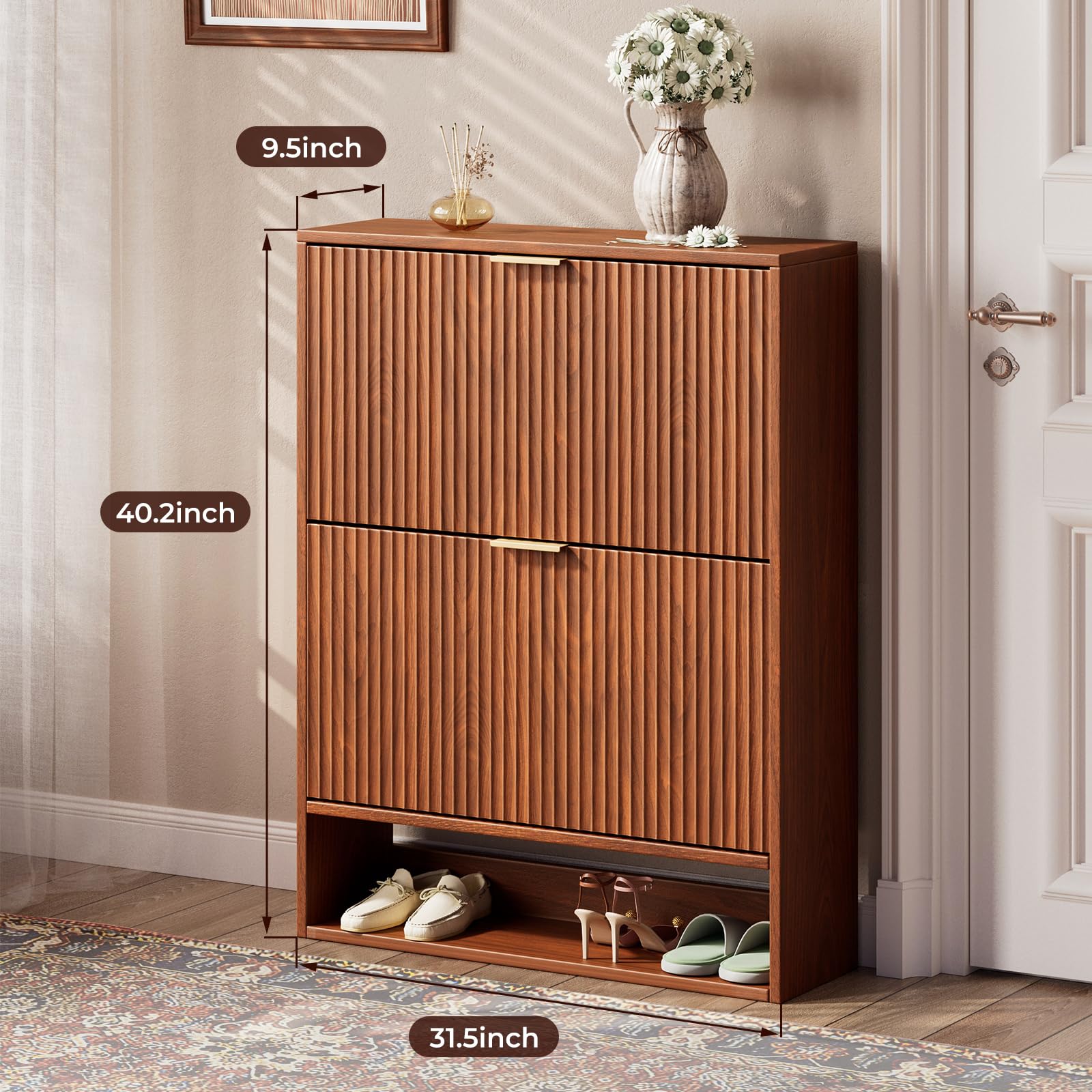 31.5''W Oak Shoe Cabinet Storage for Entryway, Narrow Hidden Shoe Storage with 2 Flip Drawers, Wooden Fluted Shoe Rack for Foyer, Hallway