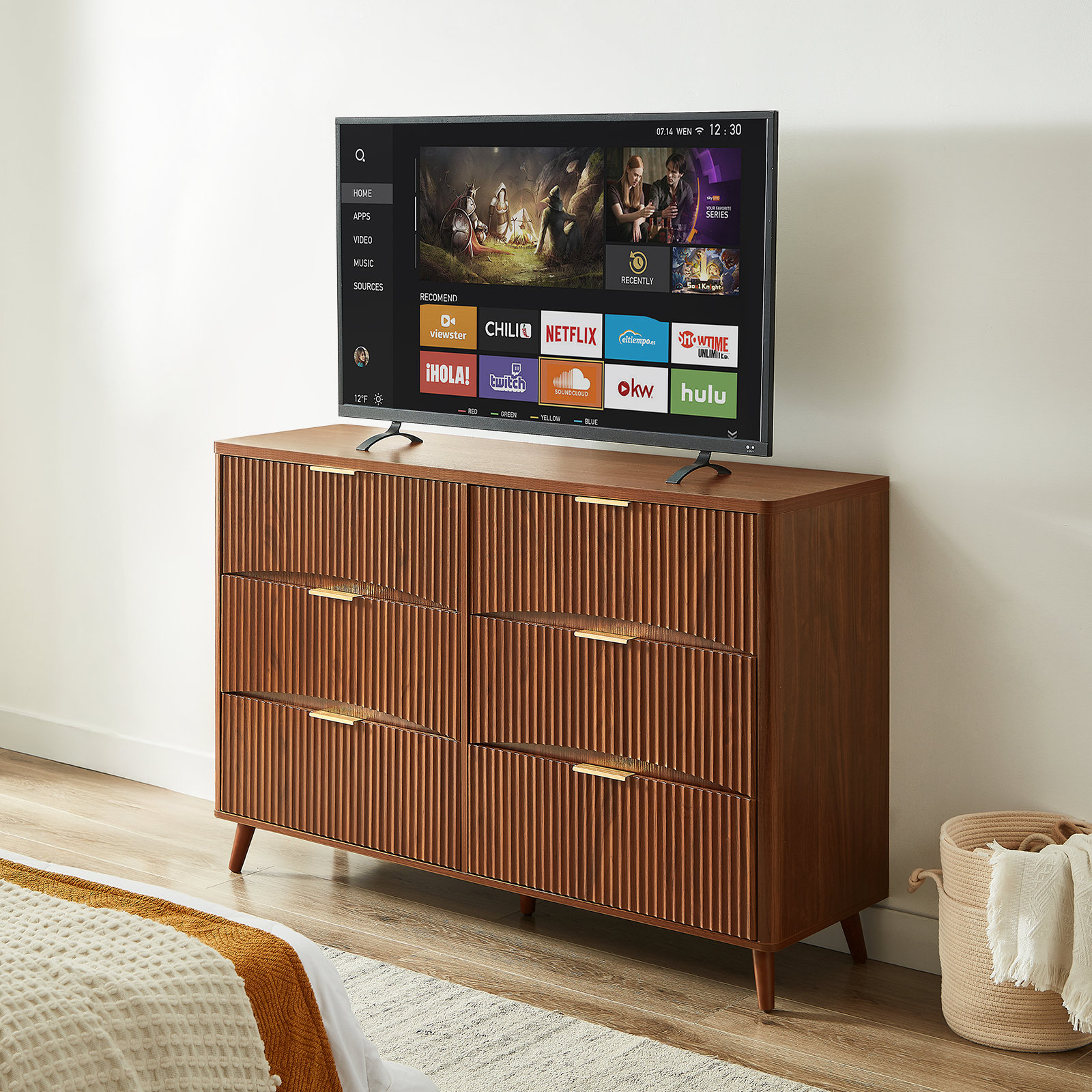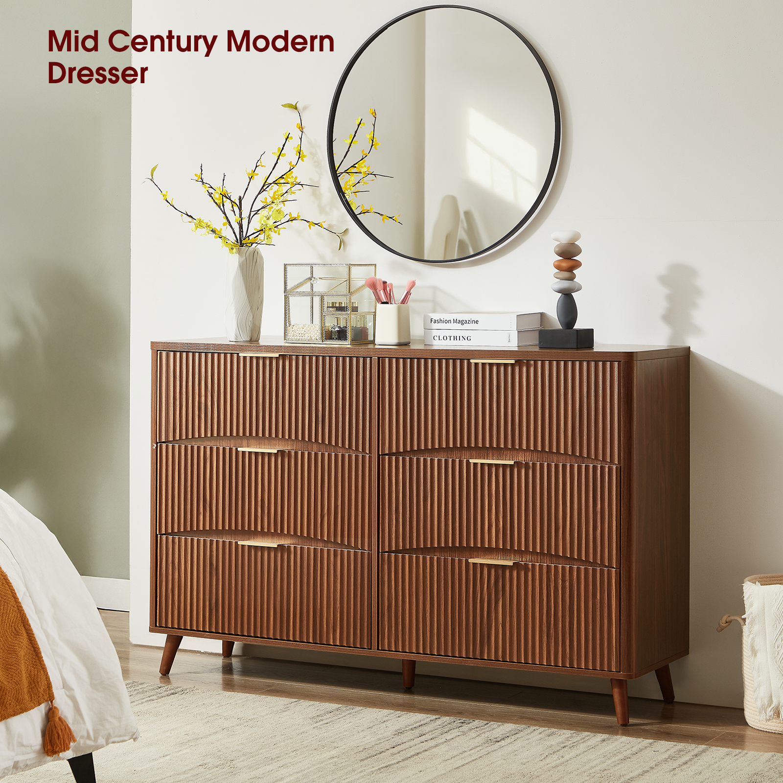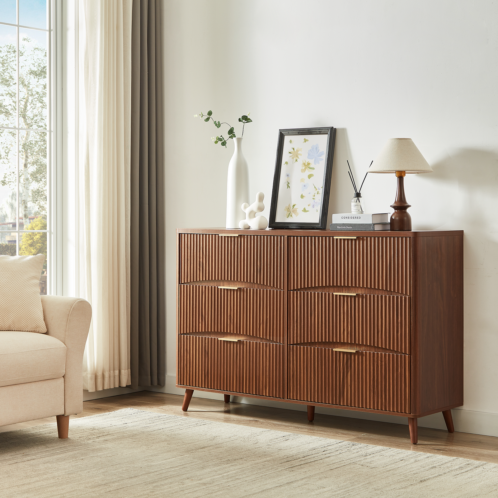 - 【Timeless Mid-Century Aesthetic】 Showcasing a sculpted fluted front and matte gold handles, this 6-drawer dresser blends retro flair with modern elegance; Clean lines and a warm walnut finish create a look that’s refined yet inviting—perfect for enhancing bedrooms, entryways, or living rooms