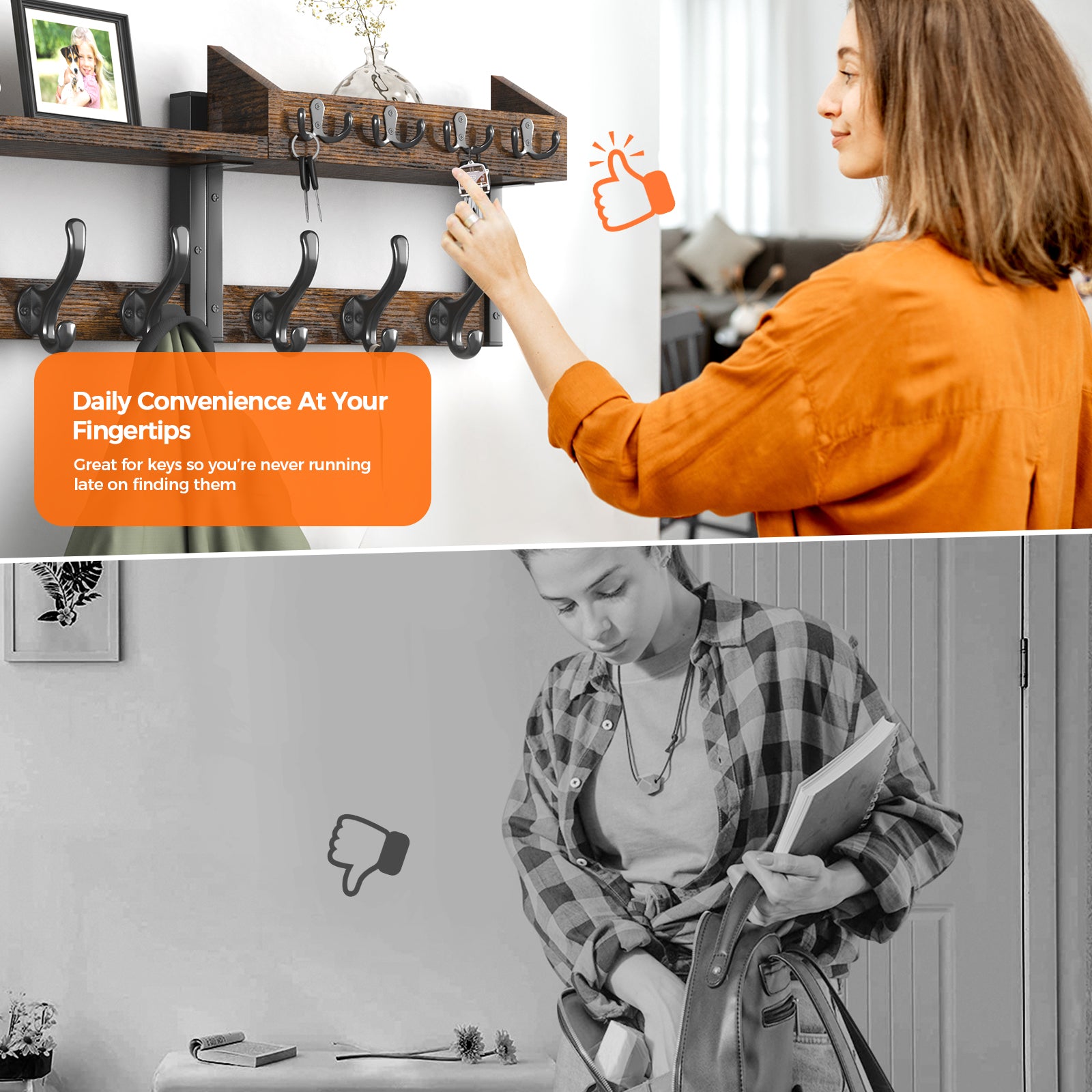 - 【Sturdy & Lasting】Crafted from quality wood and metal, this coat hooks with shelf is built to last; Reinforced 7 coat hooks and 4 key hooks ensure a reliable hold for heavy coats, purses, or towels; Dual-hole mounting provides extra stability